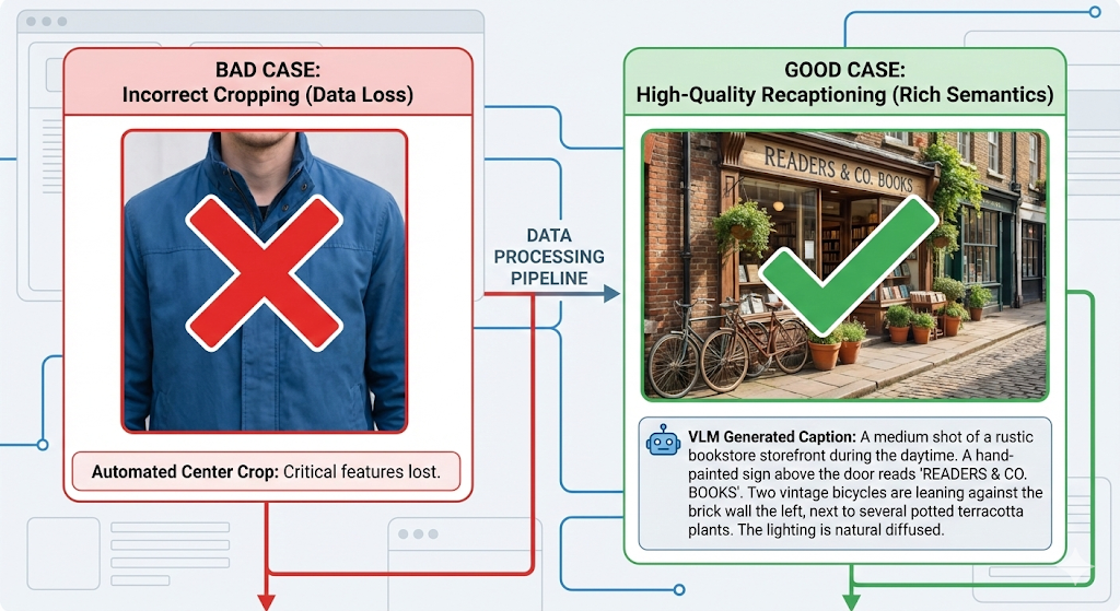 - Recaptioning (重打标):如下文第 7 章将详细阐述的,利用 VLM 生成高密度的描述,能让文本精准对应画面中的细节(如招牌文字、背景物体),从而最大化数据的训练价值。