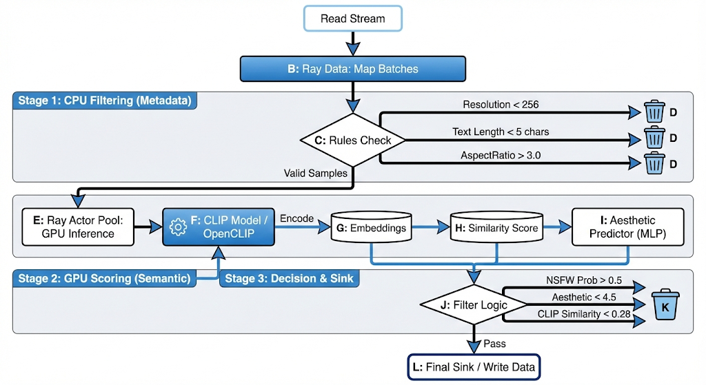 Ray Data 适合处理这种既有 CPU 密集型(解压、哈希、Regex)又有 GPU 密集型(CLIP Embedding 推理)的混合负载。下面给出一个典型的三阶段流水线设计: * Stage 1 (CPU): 快速过滤。直接剔除分辨率不足(<256px)、文本过短、非英语(如果只练英语模型)或长宽比异常的样本。 * Stage 2 (GPU): 深度特征提取。利用 CLIP 模型生成 Embedding,并基于 Embedding 计算图文相似度和美学评分。 * Stage 3 (CPU/Mixed): 逻辑判定与去重。综合安全性(NSFW)、美学分数及图文相关性进行最终阈值截断,并进行语义去重。
