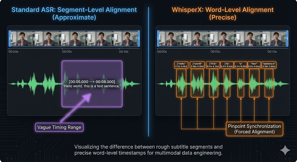 此外,声音的时序精度就是生命。如果你的字幕比画面慢了 2 秒,当画面中 Rose 在张嘴时,对应的 Token 却是 Jack 的台词。模型会错误地将‘Jack的声音特征’关联到‘Rose的面部特征’上。在万亿级 Token 的训练中,这种微小的错位会被放大为严重的幻觉。”