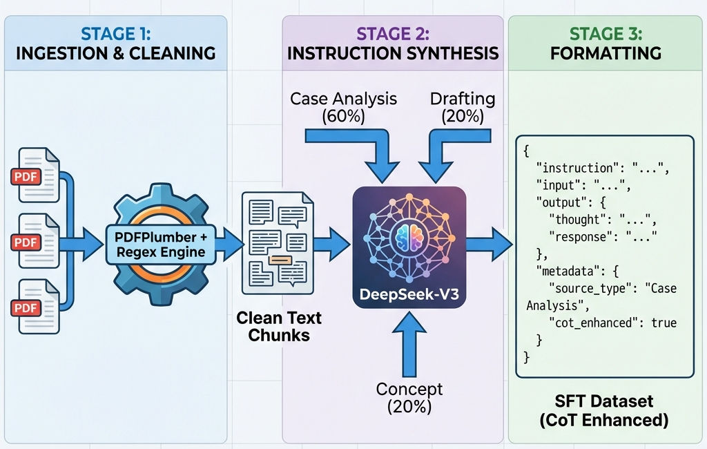 法 律)和嵌入正文的页码(如- 195 -),普通正则容易误删正文中的编号。 - 任务单一性陷阱:简单的“法条解释”不足以训练专家模型,必须构造复杂的案情分析、文书写作等多样化任务。