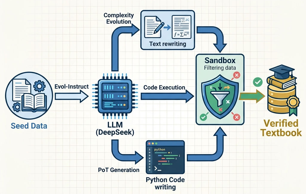 场景:提升小模型(SLM)的逻辑推理与数学解题能力。 核心技术:Evol-Instruct 进化策略、PoT (Program of Thought) 数据格式化、Python 代码执行沙箱 (Sandbox)。 输出:一本经过代码执行验证的、无幻觉的高质量合成推理习题集。