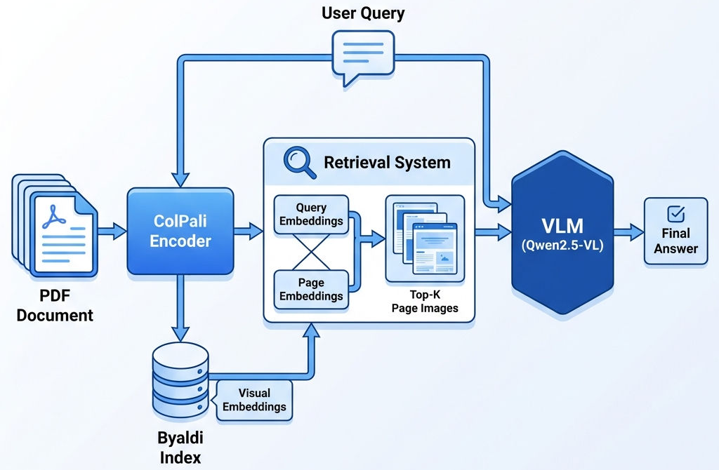 - Indexing: PDF 文档 -> 转换为页面截图 -> ColPali 视觉编码 -> Byaldi 向量库存储。